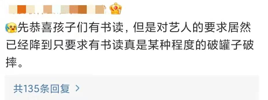 虽然粉丝们很是喜悦和激动,但是一些路人网友也对这份心情表示不解,感慨现在对待艺人的要求居然已经降到了只要有书读就行了,认为考400分以上就吹上天实在是尬夸。