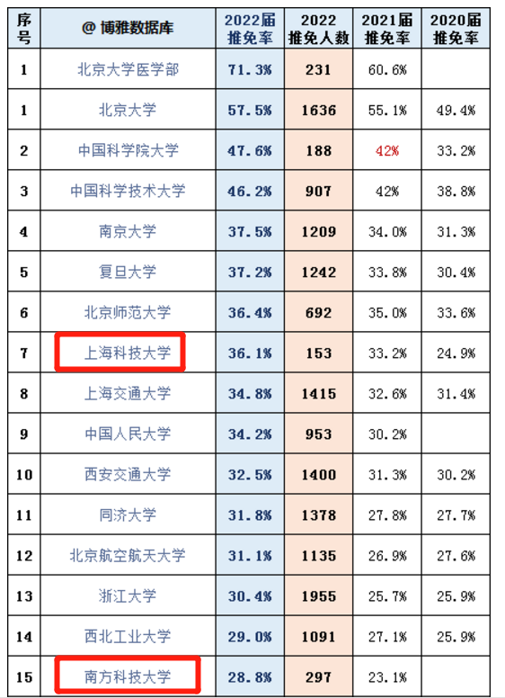 在这份榜单后6个身位,我们能看到南方科技大学的身影,它的国内升学率为35.39%,留学率为34.62%,同为科技大学,都是以科研为重,南科大和上科还是有一定差距的。