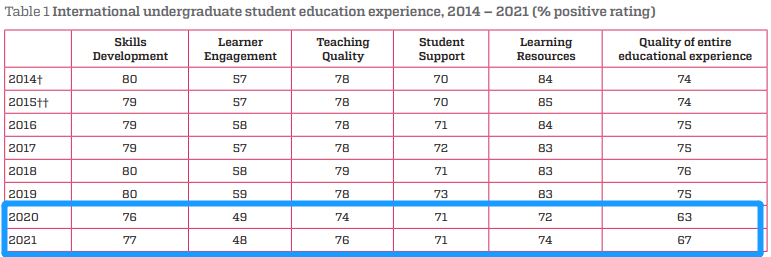 2021年,莫纳什大学本科学生的比例上升了9.6%,为70%,但仍低于73%的全国平均水平。莫纳什大学将2020年以来学生满意度的上升部分归因于他们对“数字平台、教育和教学”的投资,以及在疫情期间支持学生的新举措。