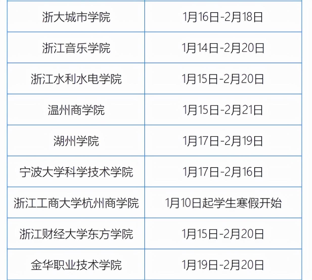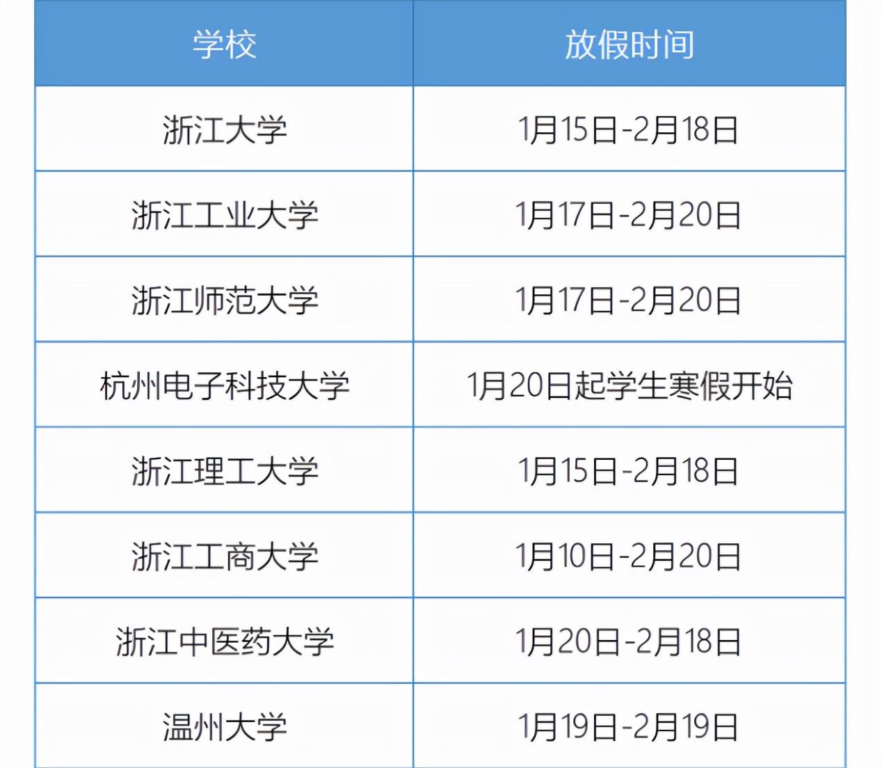 浙江多所院校的放假时间调整过后,和原来相比都提前了几天,从院校的放假时间来看,放假偏早的院校在1月的上旬就安排大学生放假了,然后在2月的下旬就安排大学生返校开学了。