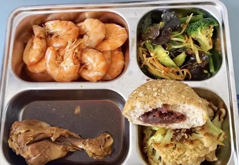 青少年时期,正是长身体的阶段,所以要多补充点优质蛋白质。这顿午餐很丰盛,两荤两素,有十几只大虾,还有一个大鸡腿,看着卖相都不错。西兰花炒木耳也比较营养,只不过还有一个清炒菜花,就显得有些重复了。