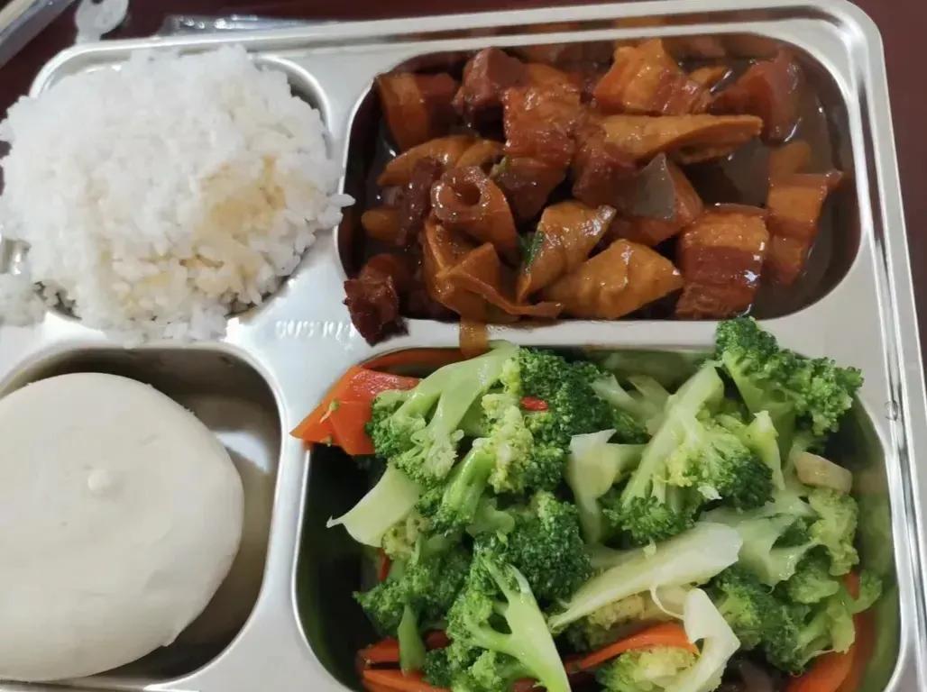 红烧肉值15块钱,西兰花值5块钱,馒头米饭3块钱,这顿饭又值20多块,值了。