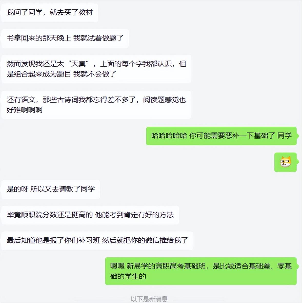 这位小伙伴也是中职生,不过毕业之后找工作一直不顺利,所以待业在家,最近刷到了中专同班同学朋友圈,知道同学被顺德职业技术学院录取,成了准大学生,这才知道原来有3+证书高职高考这一升学考试,来找新易学小编咨询考试相关内容。
