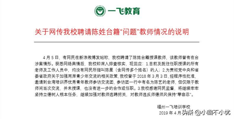 网友挖出台湾教师陈兴/陈星/陈国星,现改名陈艺,到大陆福州一飞外语教国文课,该校发声明。