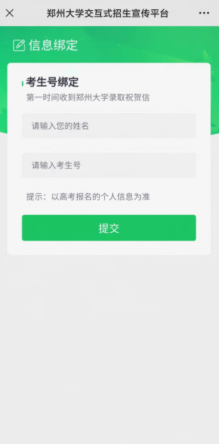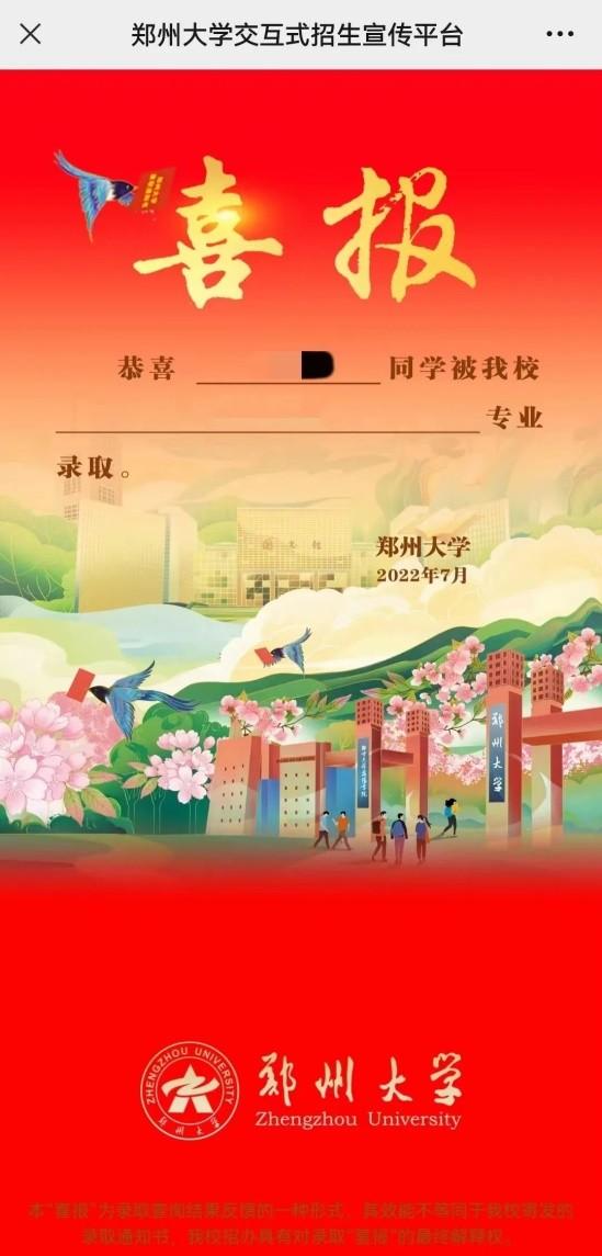 关注“郑州大学招生办公室”官方微信服务号并按要求绑定信息后,无需主动查询,服务号可在考生被录取后的第一时间自动向考生和家长推送“电子喜报”。