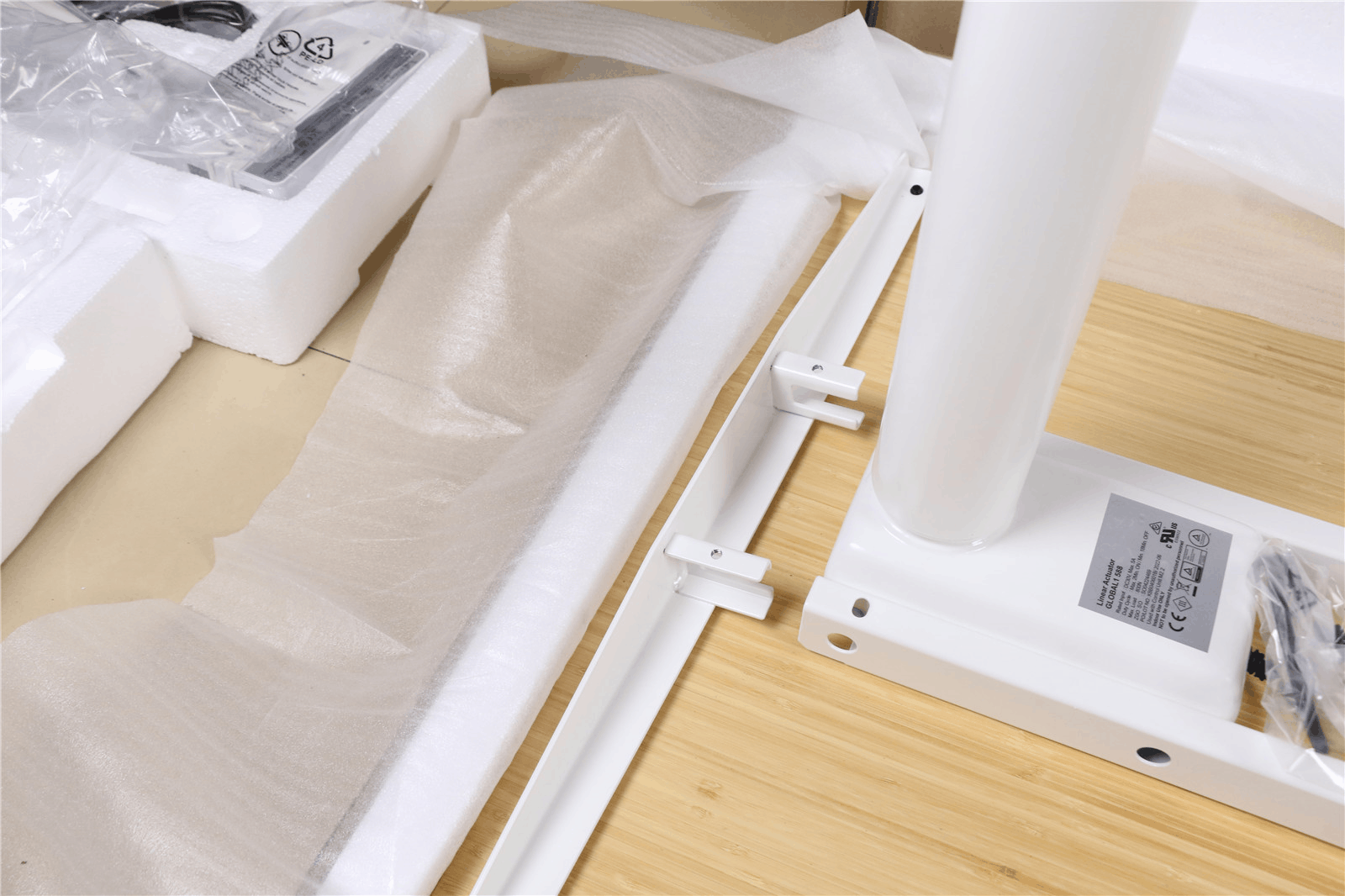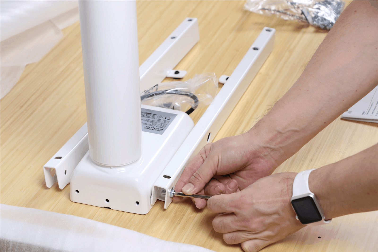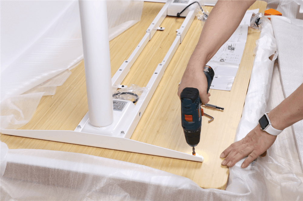 组装的第一个关键步骤,是把两侧的升降桌腿与横梁连接在一起。这样就得到了一个门字型的稳定结构,能够对桌面进行有力支撑。