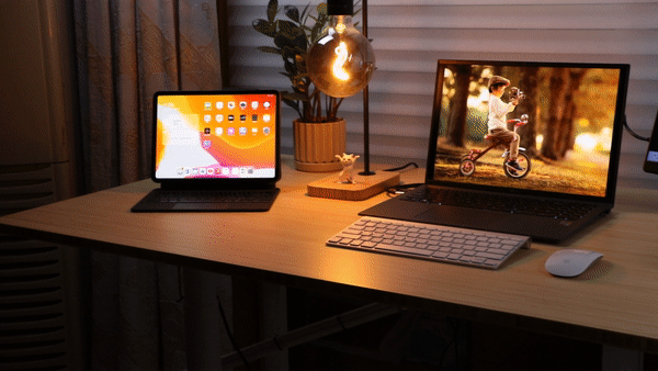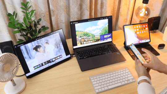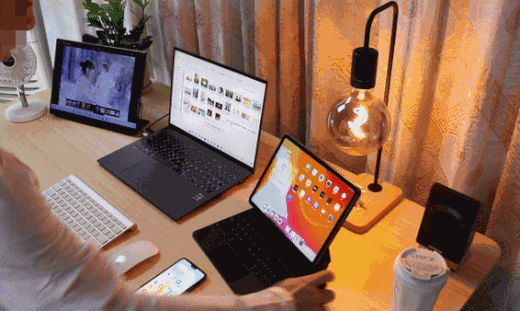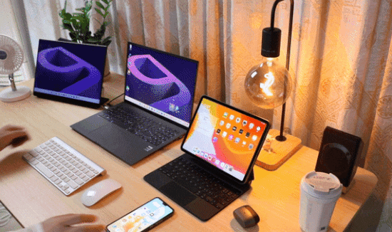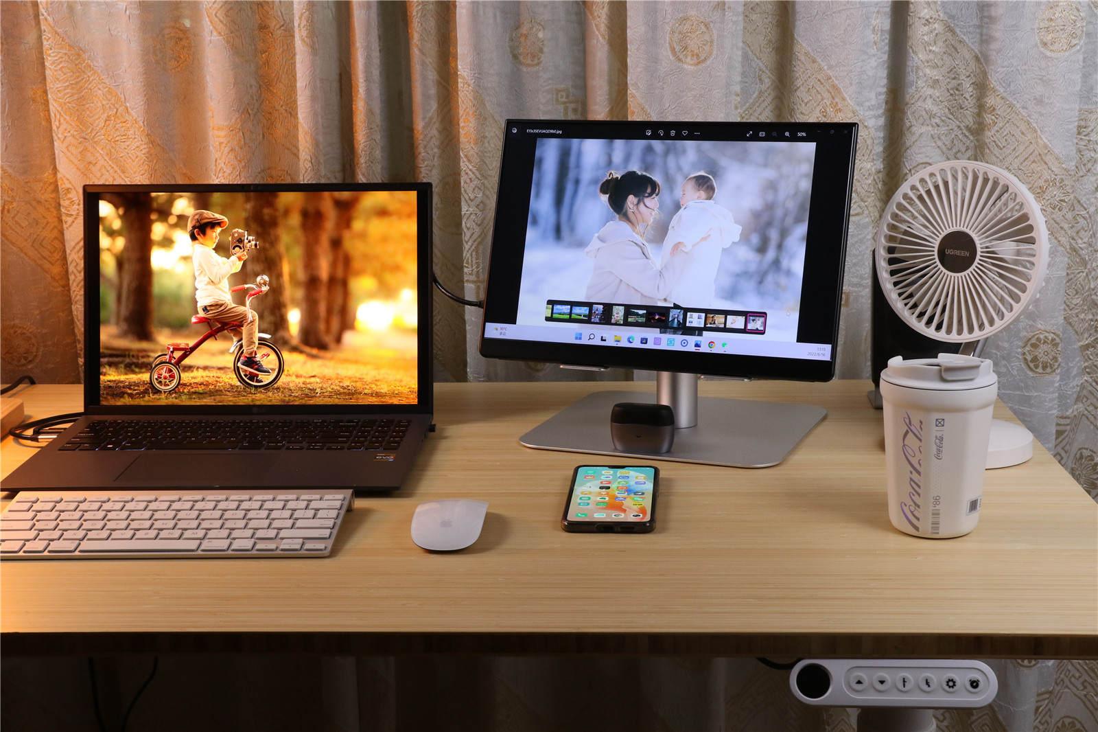 右边则是写作办公区:旗舰商务轻薄本、便携显示屏、无线键盘鼠标、音箱、TWS无线耳机、手机、咖啡杯、小风扇都分布在这里。