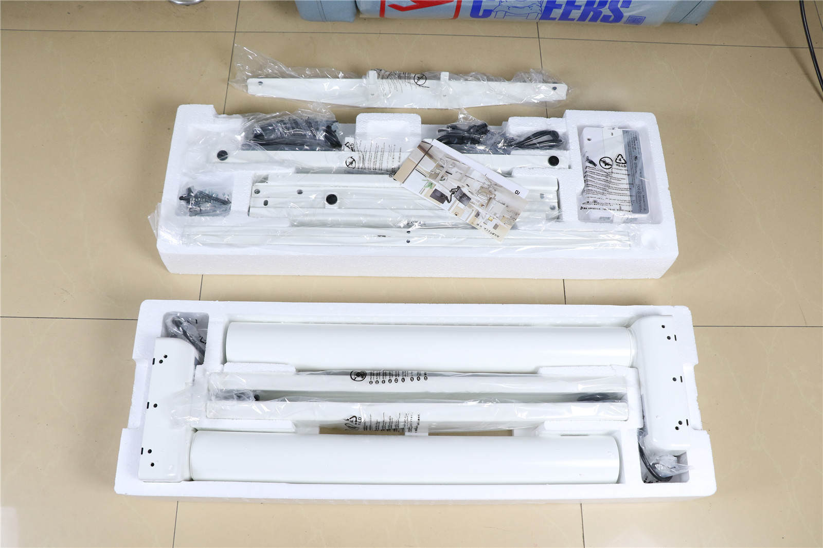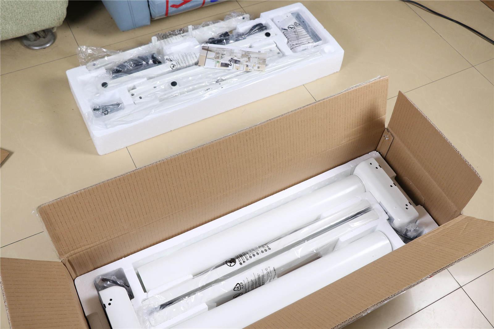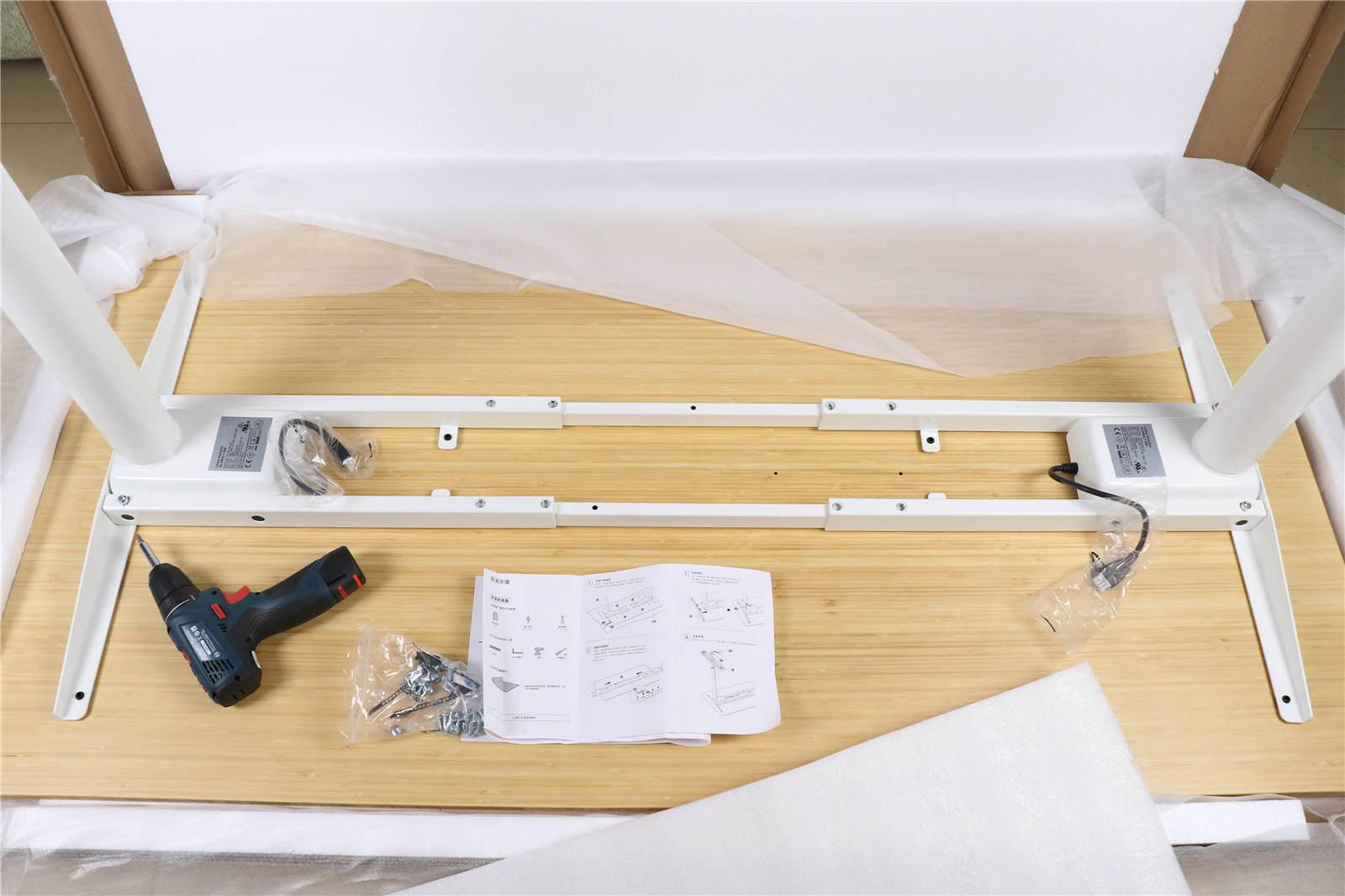 最重的桌腿和电机放在下层。上层有适配器、电源线、延长线、控制面板、横梁,以及螺丝钉、扳手等各种附件。
