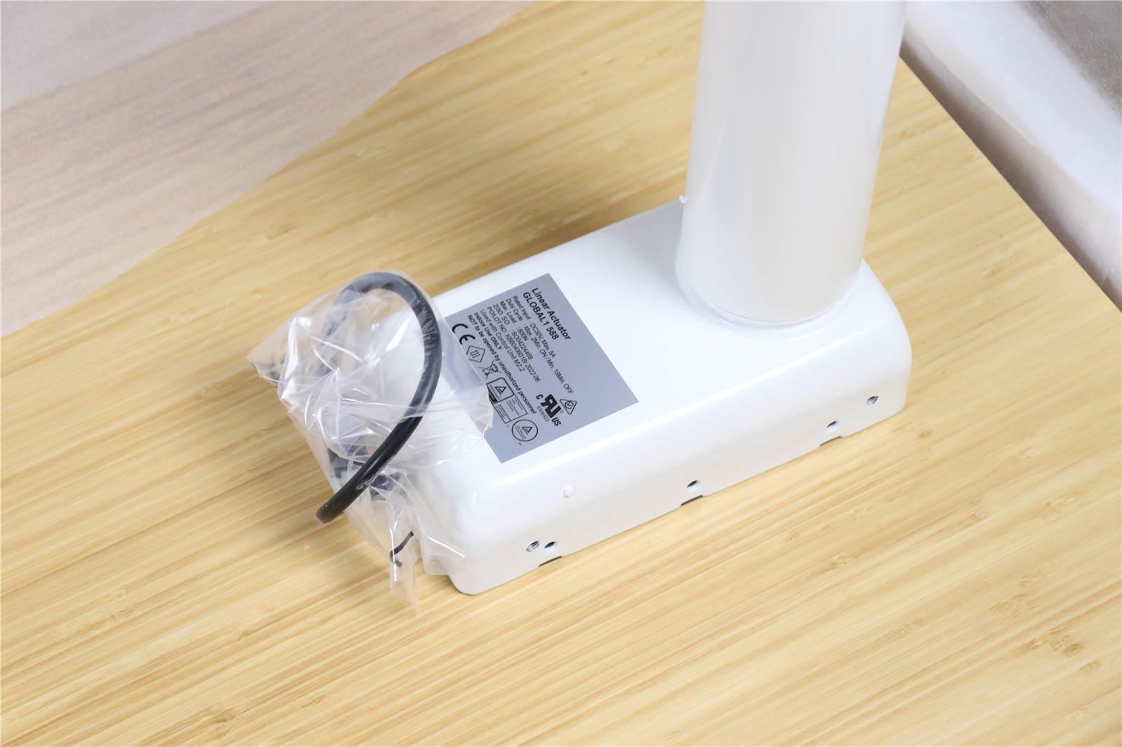 北弧M1是双电机升降桌,所以每一边的桌腿跟电机是一体的,故称为升降桌腿。圆滚滚的桌腿立柱采用航空级冷轧钢,坚固又稳重。而白色喷漆的表面工艺与竹制桌面则非常搭配。
