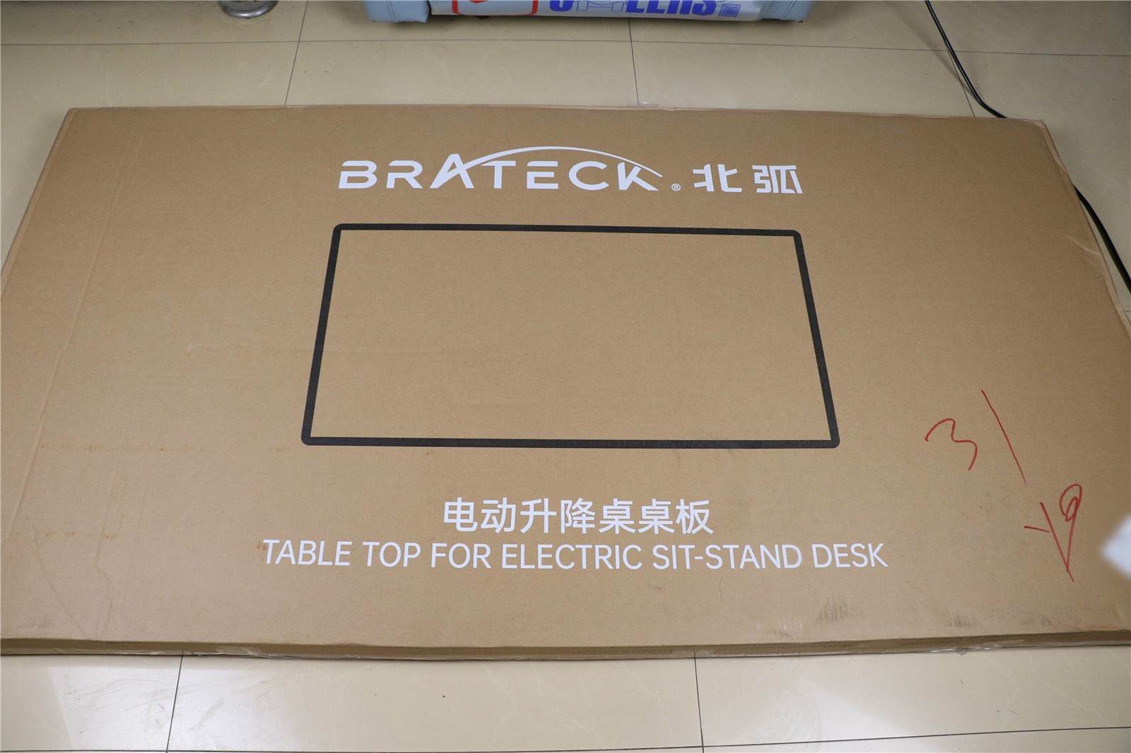 快递小哥一共送来两个包裹。这个不用说,从外观看就是桌面了,好吧,等摆放到地板上开箱时,我才发现这一面真的印有品名。桌面不是很沉,一个人就能搬动。
