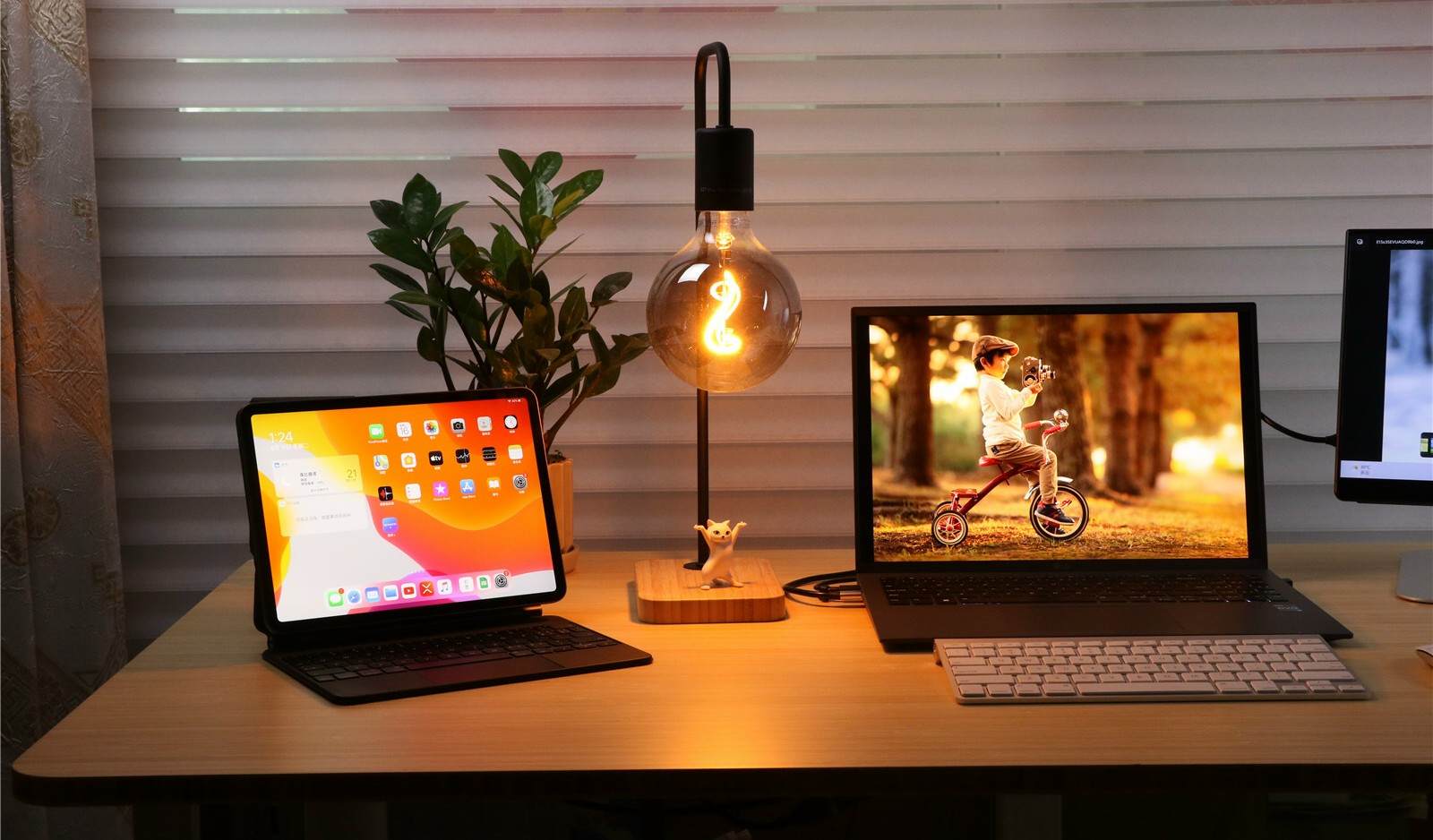 造型台灯的竹子底座与北弧M1的竹木桌面相得益彰,iPad Pro、电子书阅读器、绿植、手办都放在这一边。柔和的暖色灯光投射到自然细腻的竹木纹理上,形成了一个温馨放松的小空间。