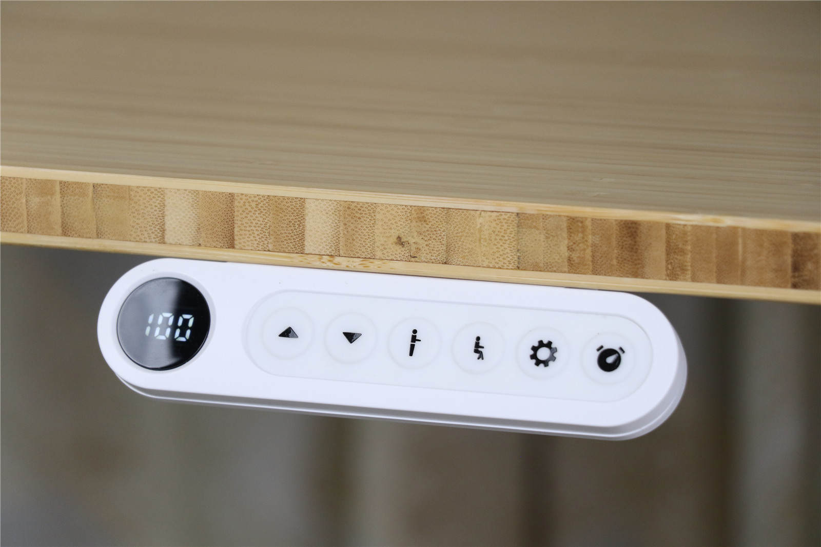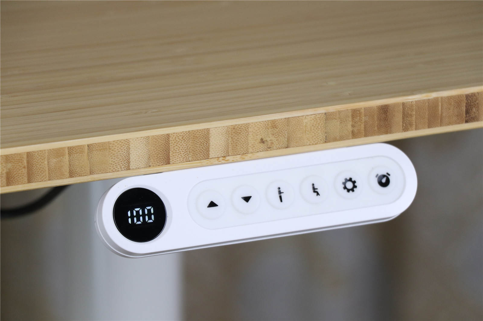 6个按钮的符号也直观易懂,不看说明书也能看出来,从左到右:上升、下降、站立、坐下(两档高度记忆)、设置、定时。