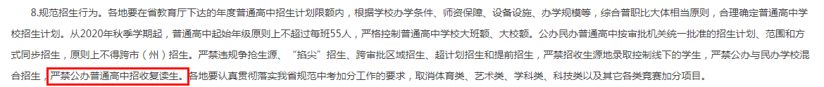 贵州教育厅发布《关于规范普通中小学招生入学工作的通知》中明确规定:“严禁公立普通高中招收复读生”。