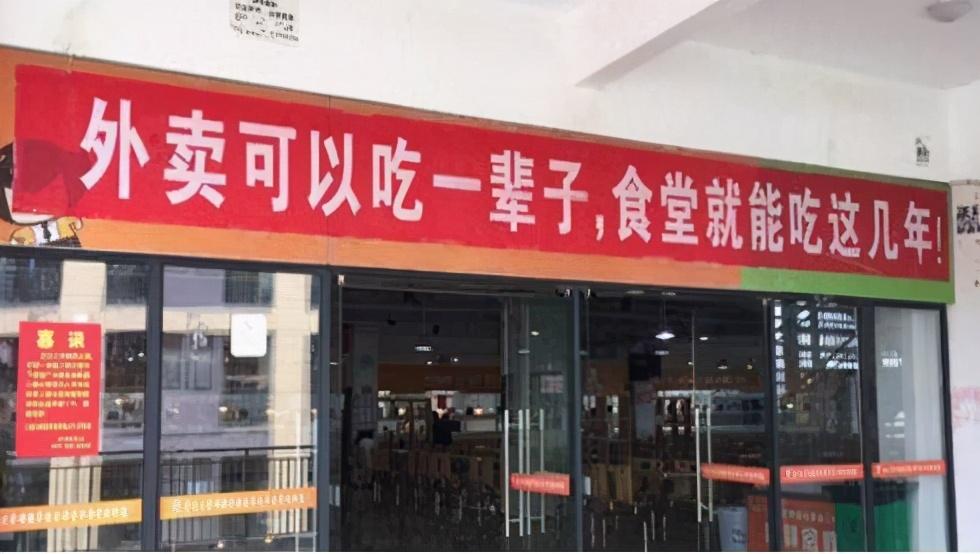 因为点外卖,去食堂吃饭的学生越来越少,食堂也是要想办法的,毕竟食堂也需要赚钱,如果学生不来吃饭,生意很难做下去,因此有的食堂开始打了食堂标语。