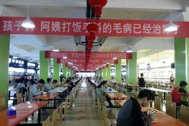食堂也是为了吸引同学们回食堂吃饭,就打上了食堂标语:“食堂阿姨手抖的毛病治好了”,同学们快回来吃饭吧,给你们打多多的,肯定吃得饱。