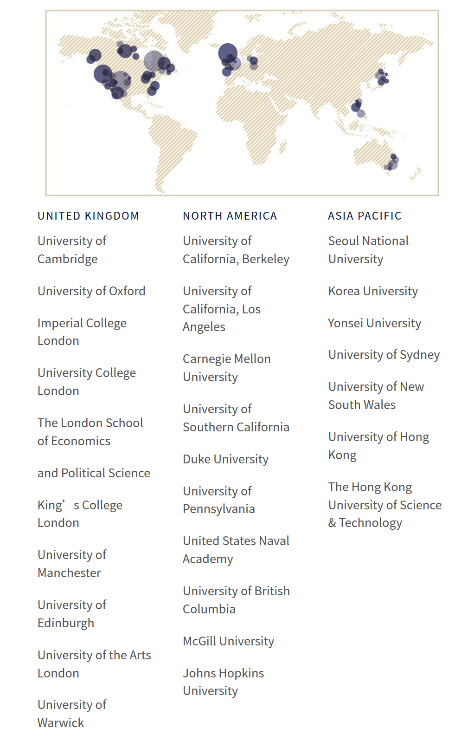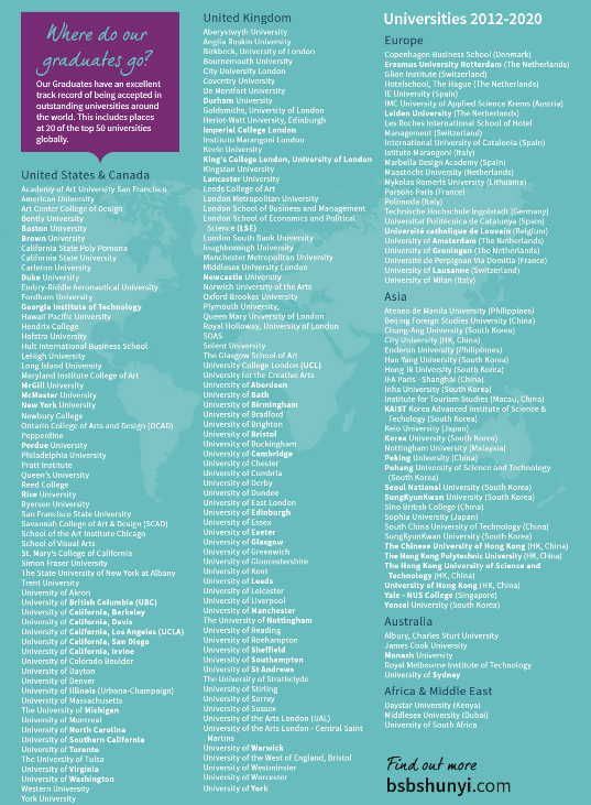 “我们的学生在世界各地的顶尖大学都有一席之地。请参阅以下我们2012-2020年毕业生收到的录取院校名单,以及附件“BSB毕业生大学目的地”中的完整列表。”