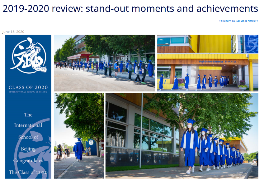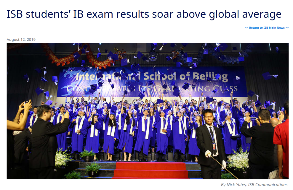“北京国际学校(ISB)的学生们正在庆祝国际学士学位(IB)文凭课程又一年的优异成绩,平均成绩为36分,比全球平均水平高出6分。ISB学生的IB平均分自2009年以来一直在35分以上。在过去的十年里,他们的平均成绩一直比全球平均水平高出5到7个百分点。我们的学生在最近一轮的IB考试中获得了96%的及格率。一名ISB学生甚至获得了最高45分。有超过50个国家的学生团体和ISB在国际学校提供领先的汉语课程,因此授予ISB学生的IB文凭中有35%是双语文凭也许并不奇怪。2018-2019年接受ISB学生入学的全球顶尖大学包括:布朗大学、加州艺术学院、科罗拉多矿业学院、哥伦比亚大学、美国海军学院、麦吉尔大学、达勒姆大学、剑桥大学伦敦经济学院,莱斯特大学医学院、大学托卡里卡德尔萨克罗库尔、香港大学和国立首尔大学。”
