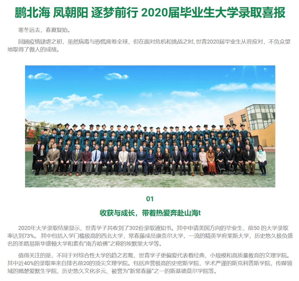 “ 2020年大学录取结果显示,世青学子共收到了302份录取通知书。其中申请美国方向的毕业生,前50 的大学录取率达到73%。其中包括入学门槛极高的西北大学,常春藤成员康奈尔大学,一流的精英学府莱斯大学,历史悠久极负盛名的圣路易斯华盛顿大学和素有“南方哈佛”之称的埃默里大学等。