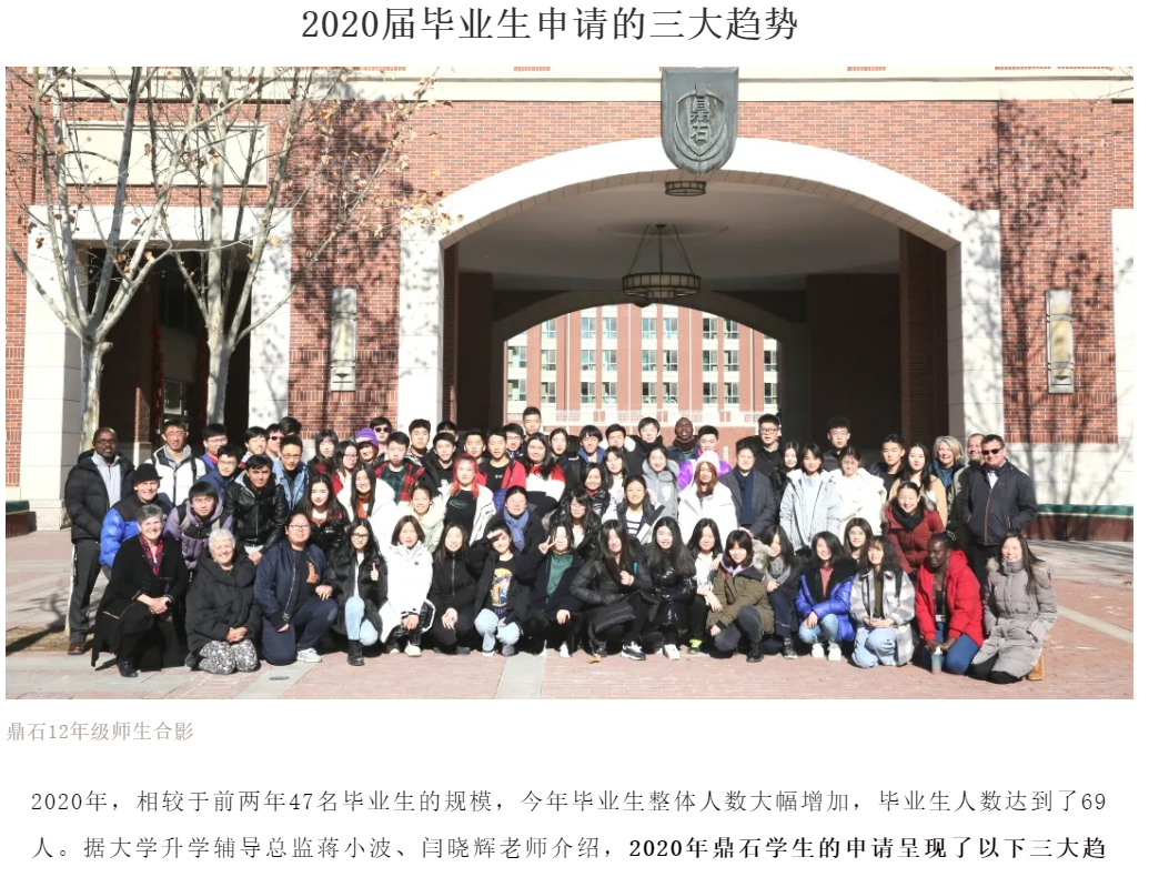 官微发布了2020届录取结果。“完整名单会于8月在网站更新”。成立于2014年,旨在融合中国、美国、国际三种教育传统的精粹。校长是美国教育风云人物,有非常出众的履历。比如,是全球中学的联合会 Round Square Association的董事会成员,该联合会在世界范围内拥有大约100个成员学校。领导过著名私立寄宿高中Choate Rosemary Hall校长一职。鼎石国际学校要求9-12年级学生必须校内寄宿。