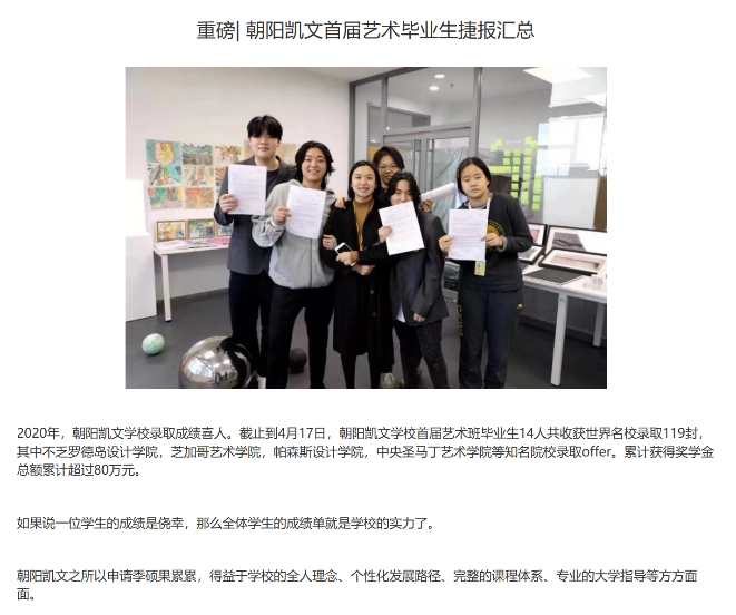 2020年,朝阳凯文学校录取成绩喜人。截止到4月17日,朝阳凯文学校首届艺术班毕业生14人共收获世界名校录取119封,其中不乏罗德岛设计学院,芝加哥艺术学院,帕森斯设计学院,中央圣马丁艺术学院等知名院校录取offer。累计获得奖学金总额累计超过80万元。”