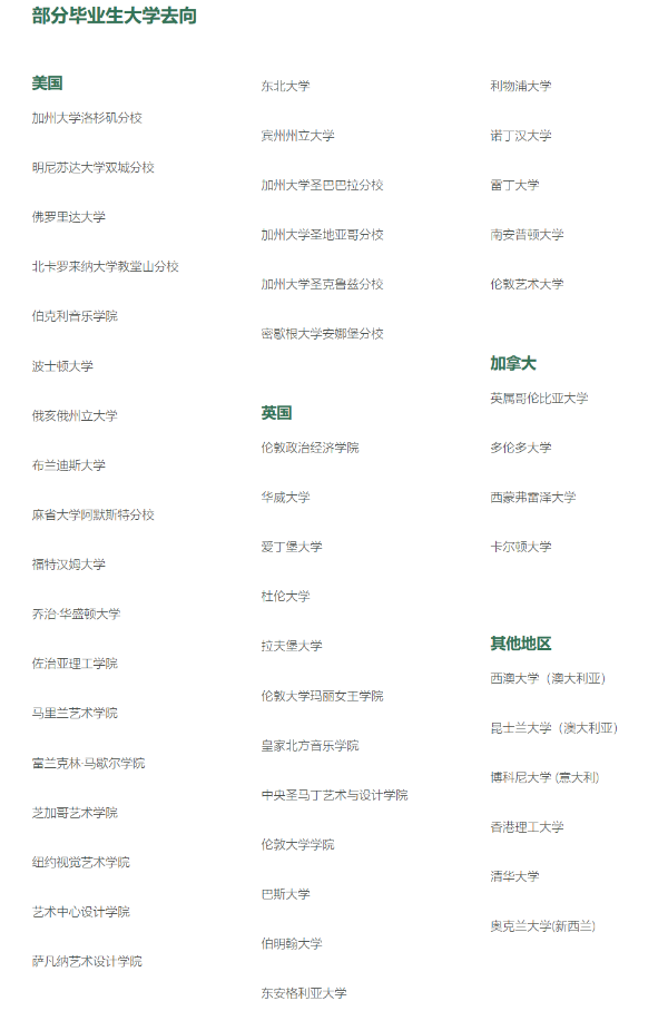 青苗历届毕业生均拿到了自己心仪院校的 offer,申请专业多种多样,涉及到音乐、艺术、体育、经济、计算机等各个领域。其中不乏伦敦大学学院、爱丁堡大学、加州大学洛杉矶分校等综合排名在 top 20 的名校,也包括伦敦艺术学院、伯克利音乐学院等专业排名优异的学校。截至目前,2020年应届毕业生的所有录取结果中:英国高校75%是QS World世界大学排名前100院校!其中排名前20的学校比例高达50%!亚太高校100%是QS World世界大学排名前30院校!美国高校85%是USNEWS美国大学排名前50院校!加拿大高校80%为加拿大前十!澳大利亚高校100%为澳洲八大!"