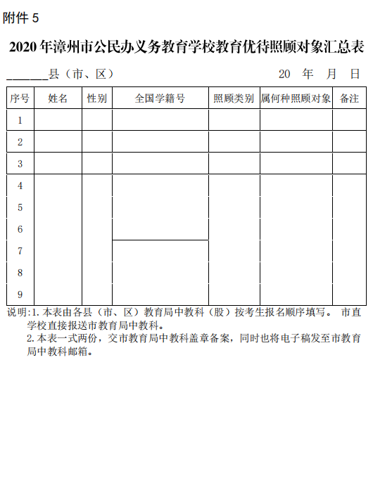 二类教育有待照顾对象学生或监护人持相关证明材料到民办学校,填写《漳州市公民办义务教育学校教育优待照顾对象登记表》(见附件4)。民办学校要做好相关材料审核工作,汇总并填写《2020年漳州市公民办义务教育学校教育优待照顾对象汇总表》(见附件5),于6月18-19日上报当地教育行政主管部门审核。