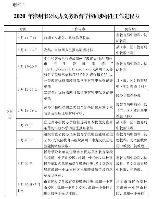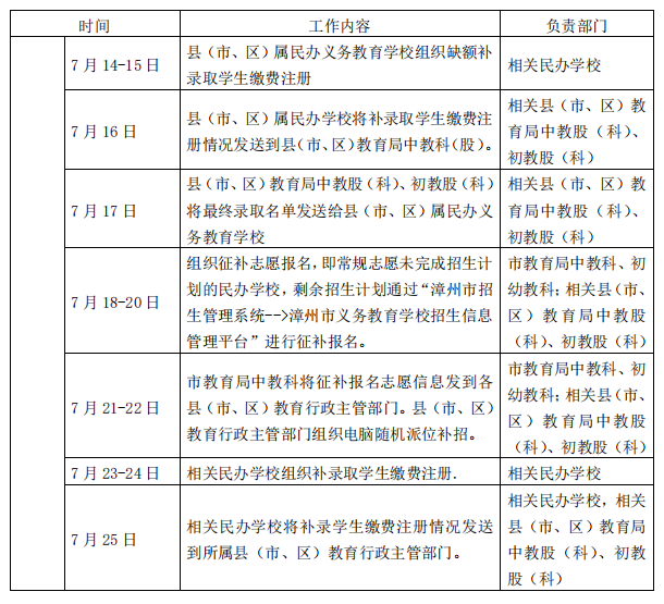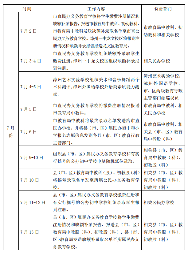 摇号时间:6 月 28 日;6 月 29 日公布电脑随机派位录取名单。报到注册时间:6 月 30 日-7 月 1 日,录取学生前往漳州一中龙文校区报到注册。逾期未到校报到注册的学生,取消录取资格。