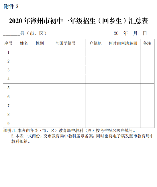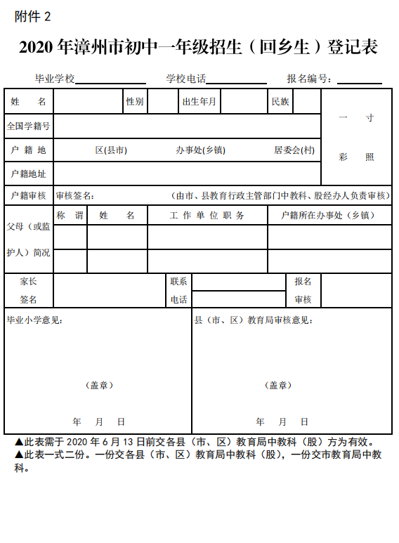1. 回乡生报名登记:6 月 12-13 日,我市(不含芗城市区) 回乡生,即在外省或外地市就读的漳州市户籍小学毕业生,或漳州市域内跨县回乡小学毕业生,由学生或监护人持户口本原件和复印件,1 张一寸相片以及在校生学籍证明材料前往当地教育行政主管部门中教股(科)填写《2020 年漳州市初中一年级招生(回乡生)登记表》(见附件 2),进行报名资格登记确认。各县级教育行政主管部门中教股(科)须及时汇总(见附件 3),并于 6月 14 日上报市教育局中教科,以便导入报名信息管理平台。