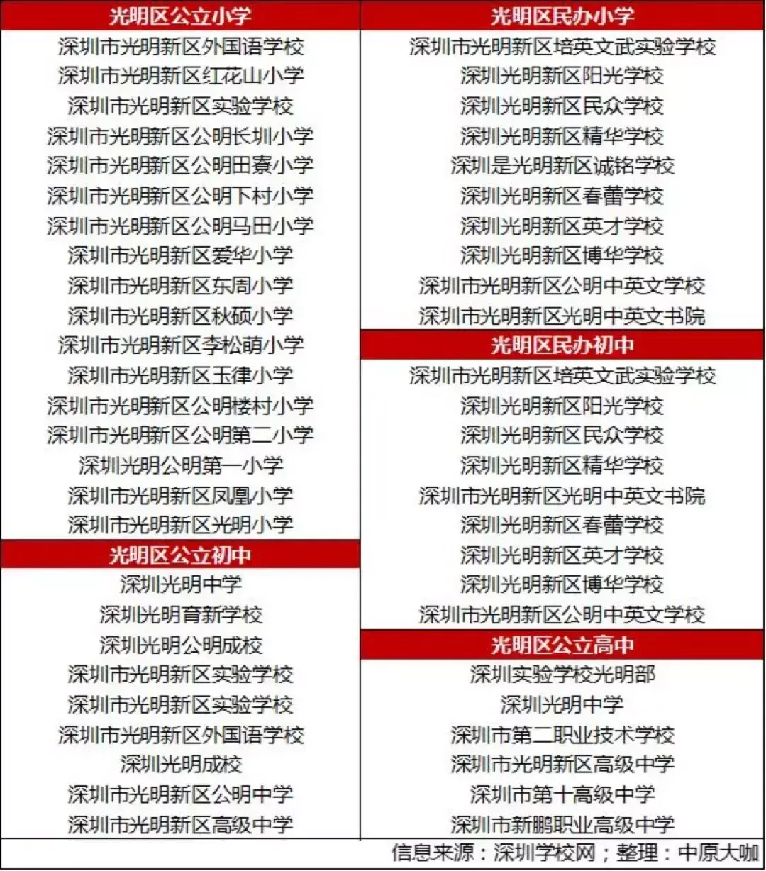 光明有中山大学深圳部,大运有港中文深圳部,但在小、中、高教育资源方面,俩区都显得捉襟见肘。光明目前有光明实验、光明外国语、凤凰小学,公明第一二小学,整体上缺乏名校,今年光明有大力引进教育资源,2019年下学期,深圳光明区有五所新改扩建学校将投入使用。