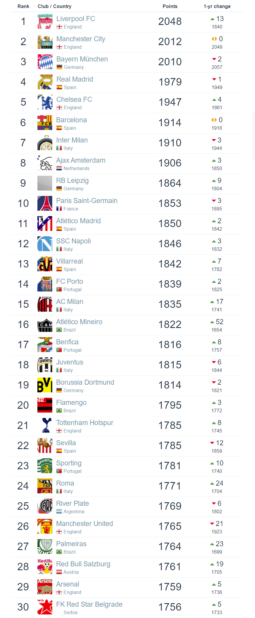 第11到20名之中,有2支南美球队,都是来自巴西的米内罗竞技和弗拉门戈。AC米兰当前位列第15,较去年同期上升了17个位,提升的幅度非常大。AC米兰有希望杀入前十,关键看能否夺得本赛季的意甲冠军。尤文图斯连续下滑,现阶段已经跌到第18位。