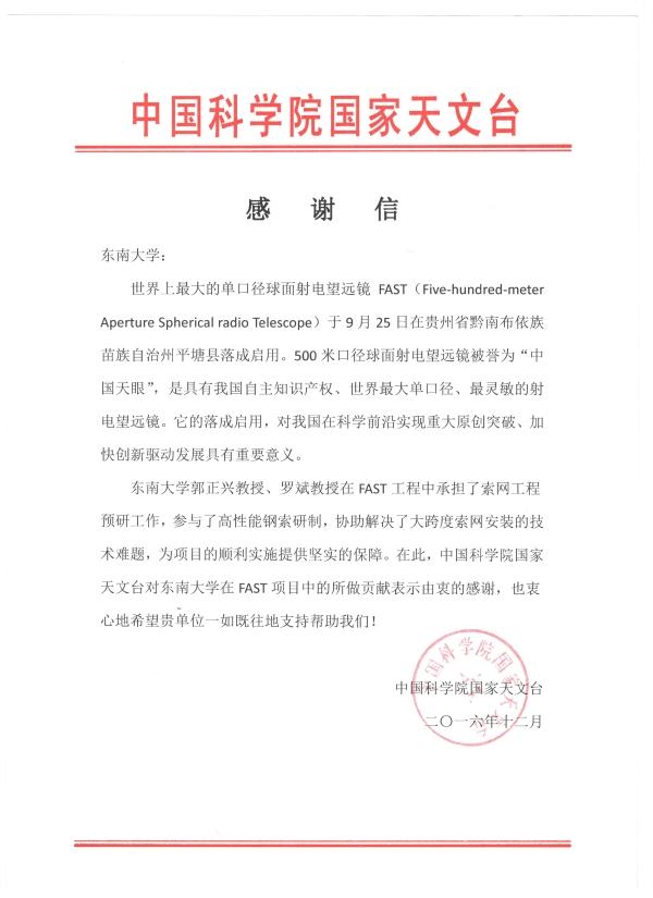 · 以郭正兴教授为首的团队承担了 "中国天眼"FAST反射面支承结构索网施工阶段的技术支撑,解决了若干关键技术问题。FAST落成启用,中国科学院国家天文台的感谢信,直接寄到了学校。