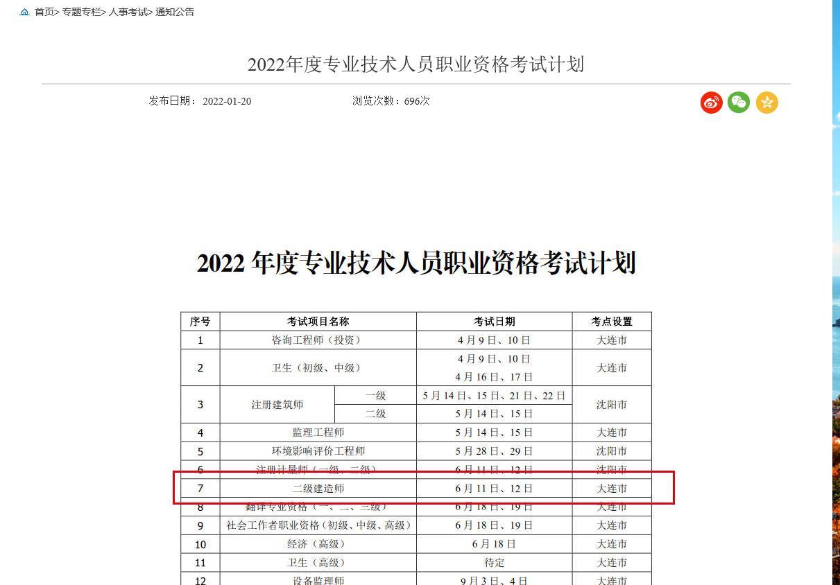 1月20日,辽宁省大连市人力资源和社会保障局公布了2022年二级建造师考试时间