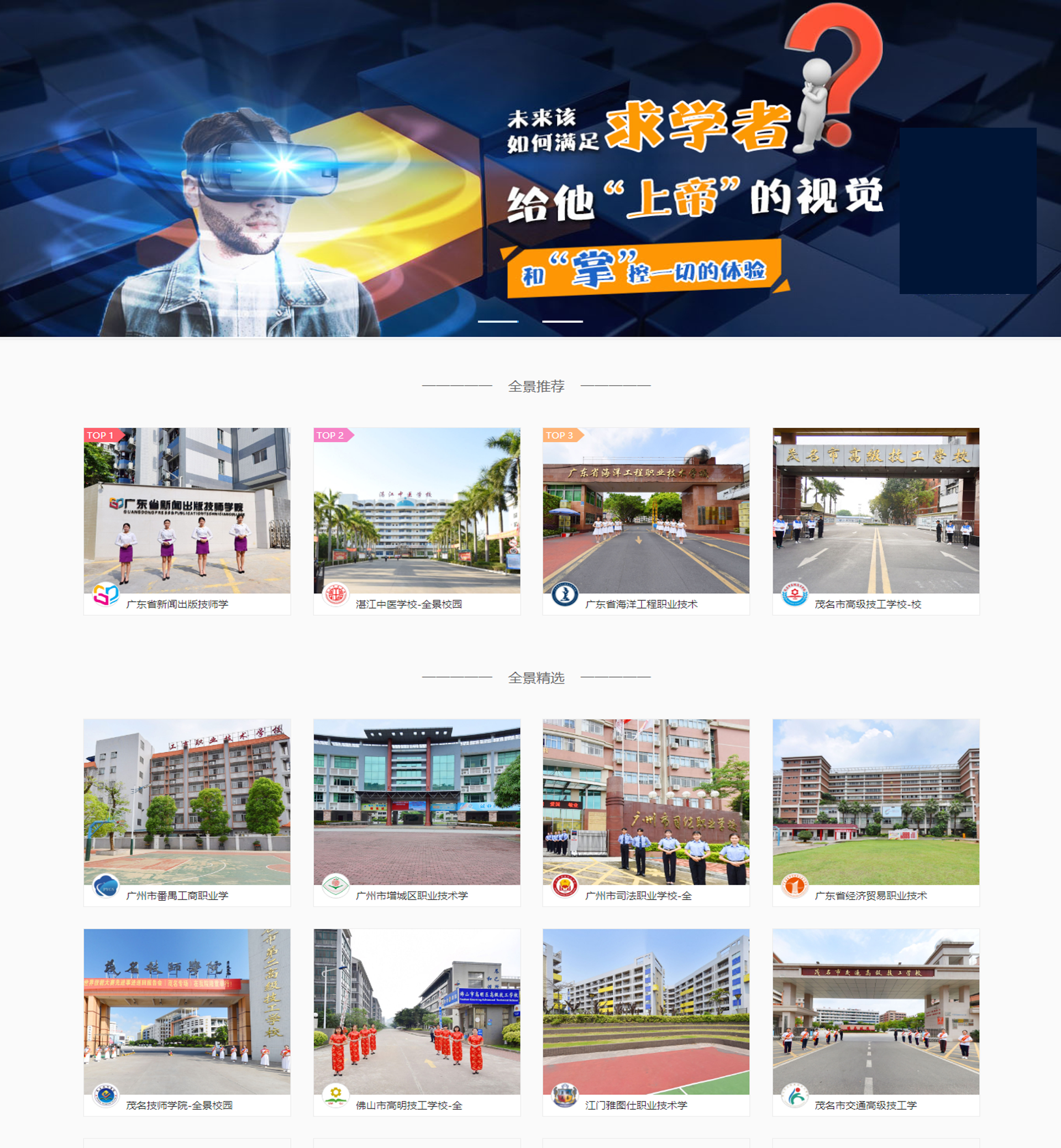 全景校园平台是我们运用3D+虚拟现实技术推出国内领先的VR校园服务平台,融合互联网、3D全景、虚拟现实三大产业,被广泛应用于各大职校招生宣传(如:广东省华侨职业技术学校、广东省民政职业技术学校、广州市天河金领技工学等)。