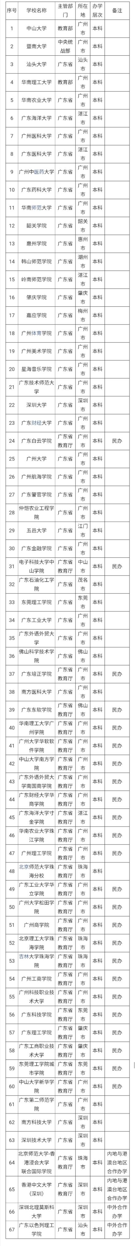 广东省的本科院校共计有67所,排名全国前100的学校有中山大学,华南理工大学,暨南大学,华南农业大学,华南师范大学,广东工业大学。