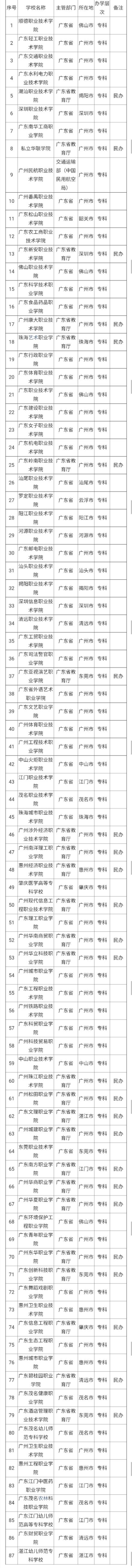 广东省专科学校共计有87所,其中民办学校有25所。