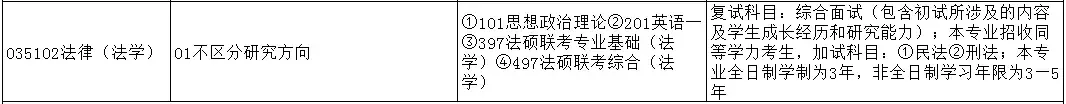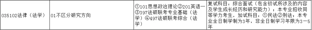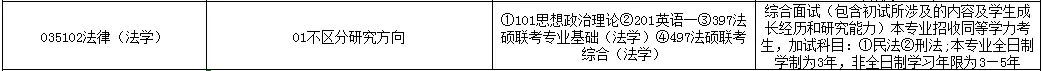 法律法学(035102)是法学院开设专业,该专业并不区分研究方向,初试考试科目为政治、英一和两门专业课,并接收同等学力考生。详情如下>>