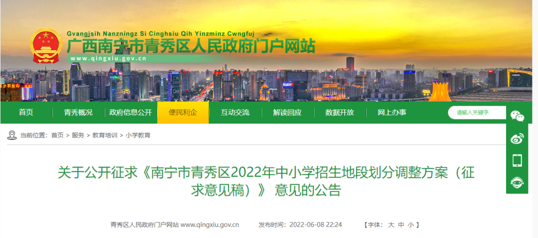 随着良庆区2022年学区地段划分征求意见稿发布之后,昨晚青秀区2022年的学区地段划分征求意见稿也悄然而至。