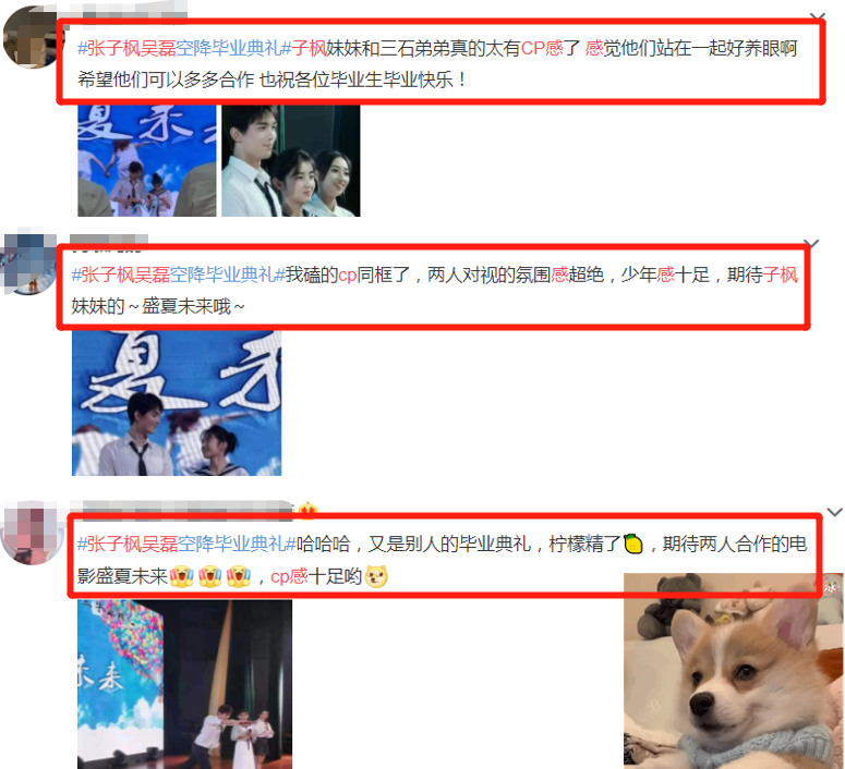 在“吴磊张子枫空降毕业典礼”话题上,诸多吃瓜路人下场:张子枫妹妹跟三石弟弟真的是太有CP感了,隔着屏幕都觉得二人十分登对!二人同框画面太美,期待电影!这两个人CP感十足,两个人站在一块就觉得特别养眼!