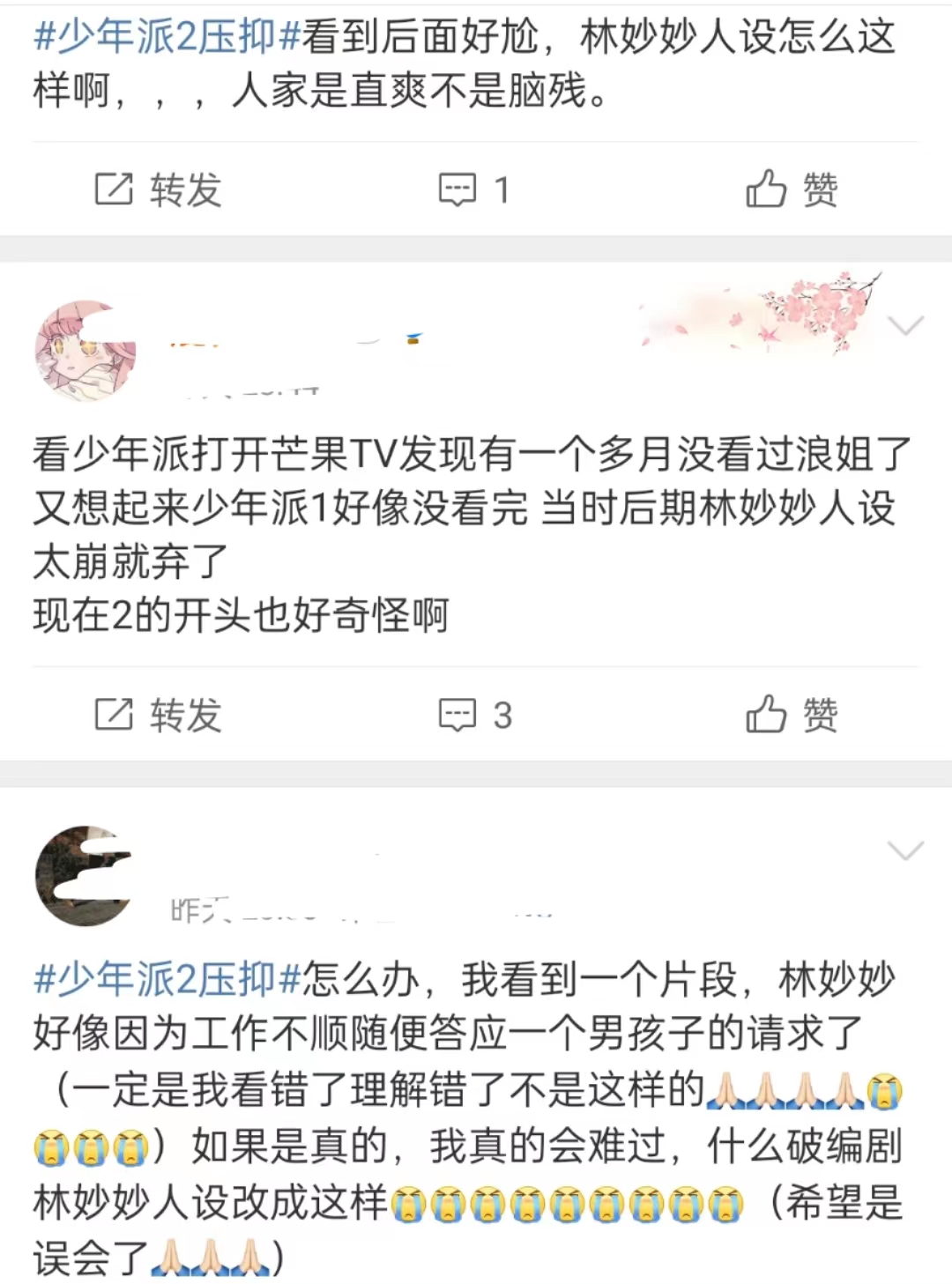 不少剧粉看到第一集十分失望,催了4年的《少年派2》,以为是甜甜的校园恋,没想到是压抑的毕业季,每个人都有数不尽的苦恼。但最令粉丝无法接受的是林妙妙的人设崩塌。