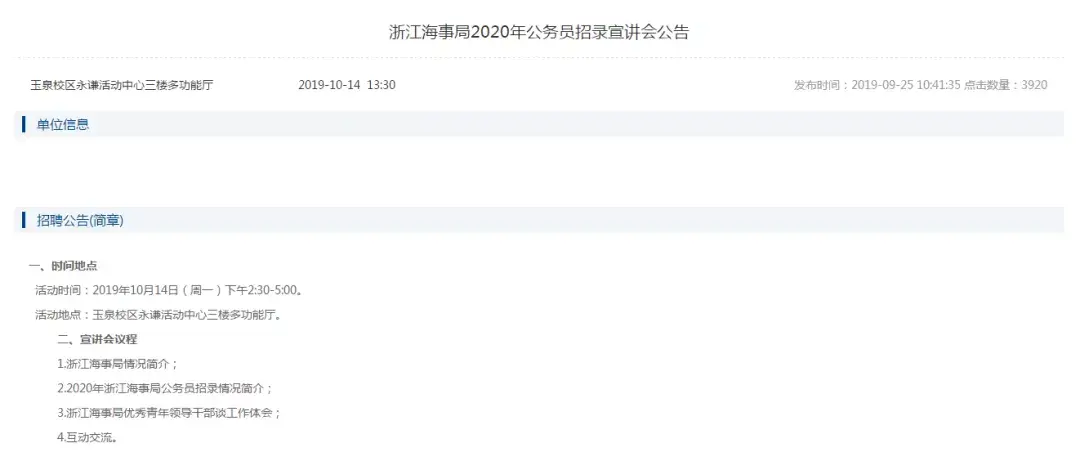 其实往年有部门国考公告发布之后,再举行宣讲会的情况,甚至可能同一天进行,可以参考2020年国考。2019年10月14日国考公告发布,当天还有浙江海事局举行宣讲会。