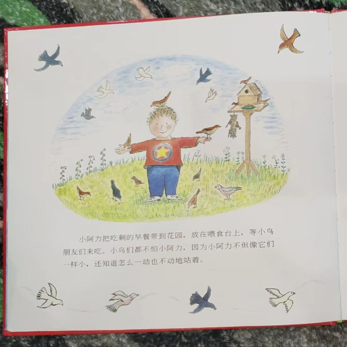 就像小阿力一样。小阿力没有再找妈妈,他找小鸟去倾诉了。为什么是小鸟呢?绘本中有写到“小鸟们都不怕小阿力,小阿力不但像它们一样小,还知道怎么一动不动地站着。”