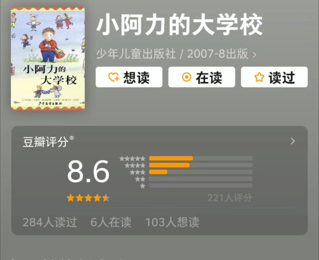 这本《小阿力的大学校》也属于入园系列的经典绘本之一了,在豆瓣达到8.6的高分。故事的内容是:小阿力准备上学了,他很兴奋,但也很担心,因为上学这事,他担心得晚上都做恶梦了。后来,他照顾了一只受伤的小麻雀,当他看着小麻雀自己站起来,飞向大世界的时候,他也获得了进入大学校的勇气。