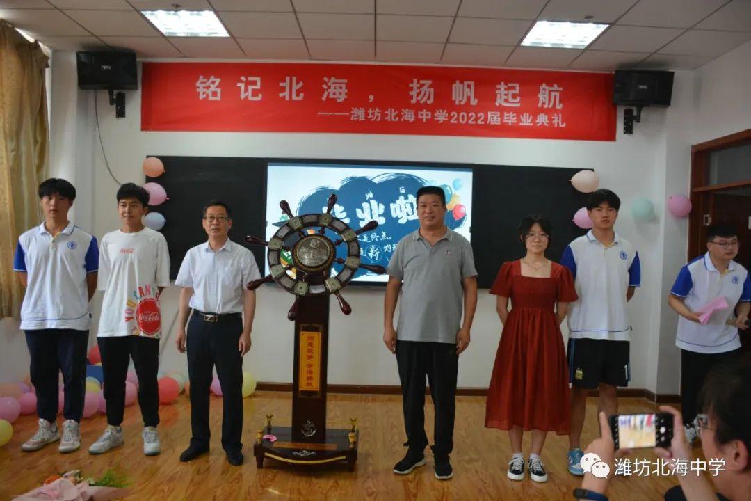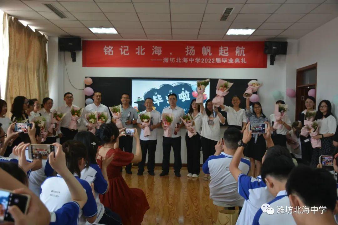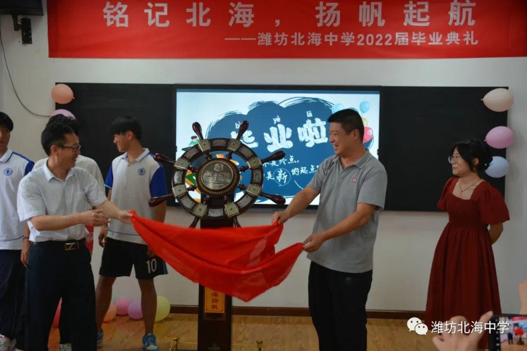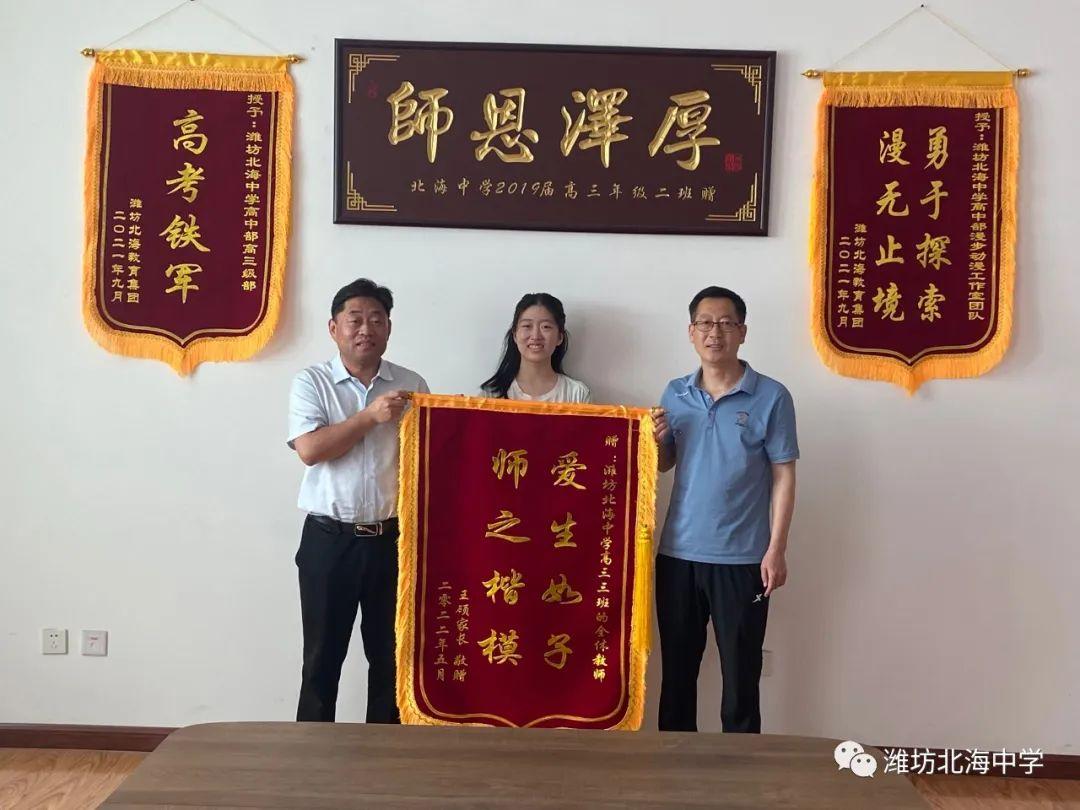 潍坊北海高中高三3班王硕及家长将绣有“爱生如子,师之楷模”字样的锦旗,亲手交到韩少海主任和孙国明主任手上,以此感谢学校和全体高三教师在2022年高考辛勤付出。