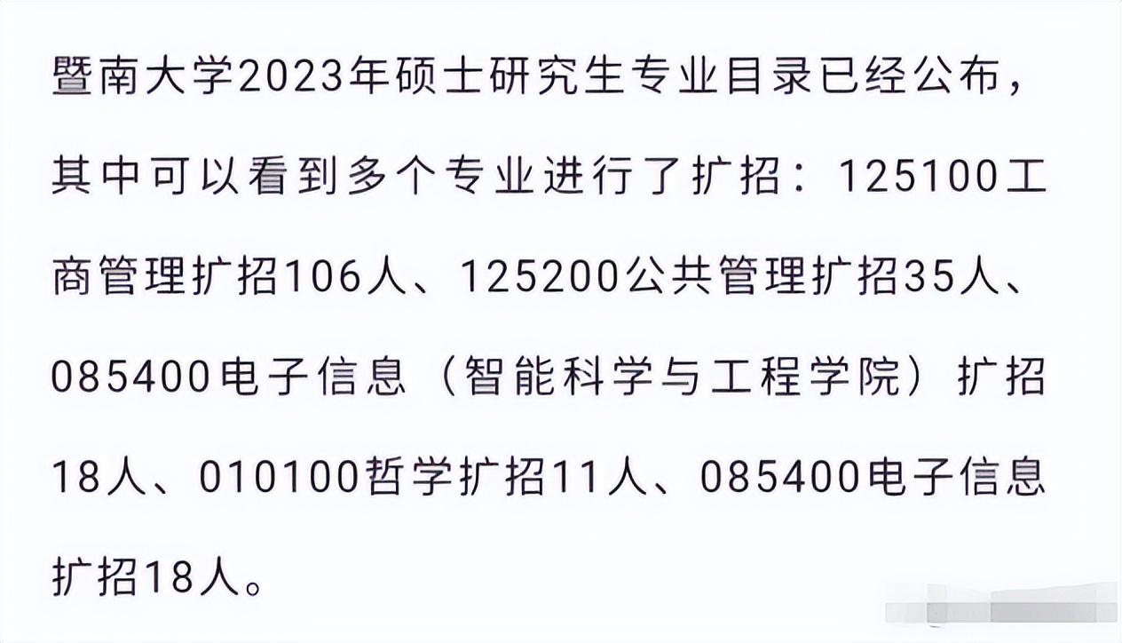一所高校研究生招生的人数越多,学生们成功上岸的可能性也会越大。所以下面我们来了解一下,在2023年考研中,有哪些院校会进行扩招呢?目前暨南大学、西北师范大学、南昌航空大学都发布了将会进行扩招的消息。其中暨南大学的研究生专业目录中已经公布了,工商管理专业将会扩招106人,公共管理专业将会扩招35人,电子信息专业将会扩招18人。
