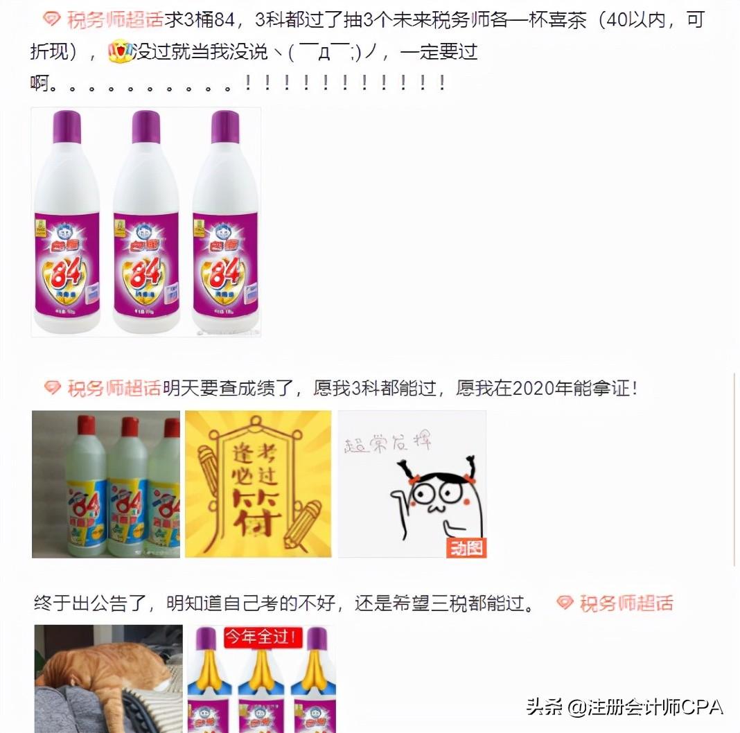 尽管每年都说考试成绩合格标准另行通知,但都是84没变,因此“84消毒液”也就成了大家的一个美好寓意。