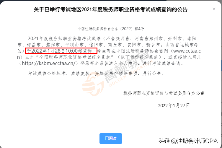 中税协:2021年税务师成绩将于2022年1月28日10:00起开始查询!