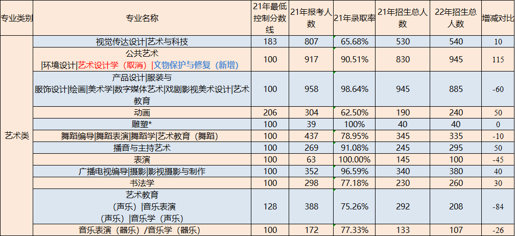 艺术类招生减少的专业有五个,但好在往年的录取率都较高,而且艺术类报考人数一般不会大幅增加,所以考试也不会太难。