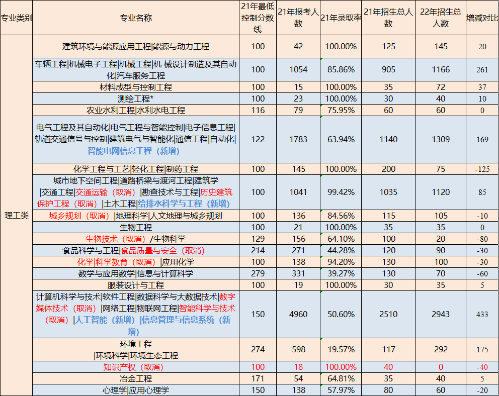 理工类大部分专业22年招生量都有所增加,制药工程、生物科学、数学与应用数学专业招生数量减少较多,分数线将会上涨