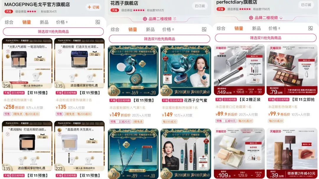 与花西子、完美日记天猫旗舰店动辄上千万的粉丝数量相比,毛戈平天猫旗舰店的粉丝数量不到500万。天猫旗舰店显示,毛戈平销量第一的产品有9万+人付款,花西子、完美日记销量第一的产品付款人数均超过20万。
