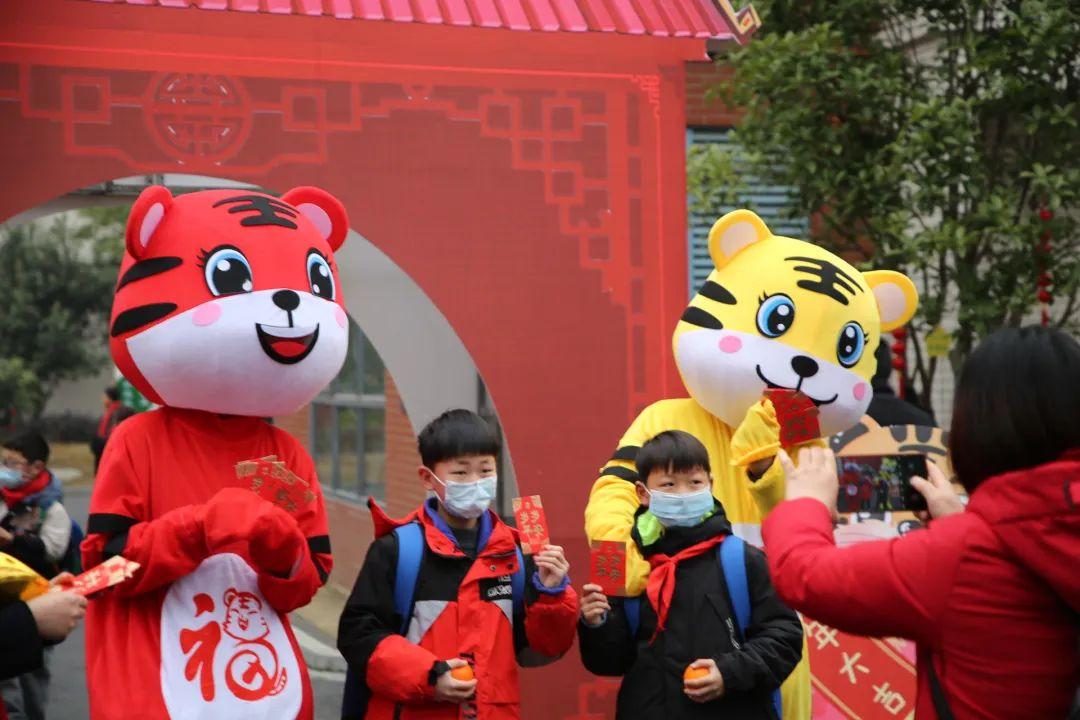 同学们来到一道红色古风拱门前,在“虎仔”的带领下,大家走过挂满红色灯笼的道路,来到“红包墙”面前,领取特殊的新年红包。